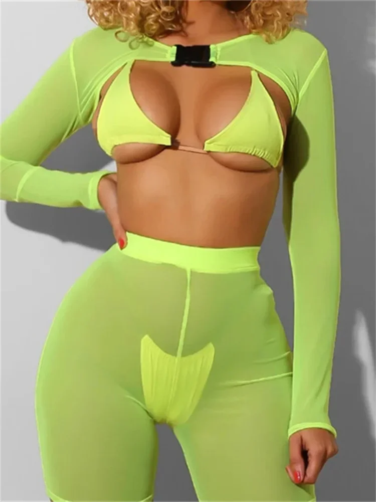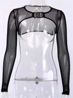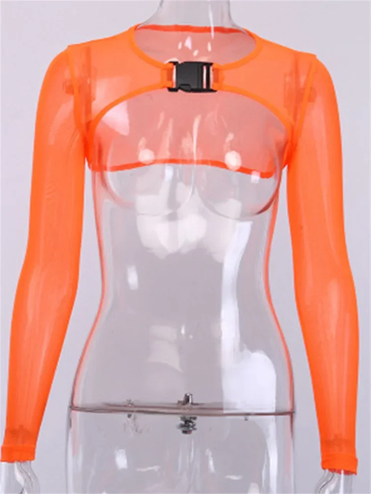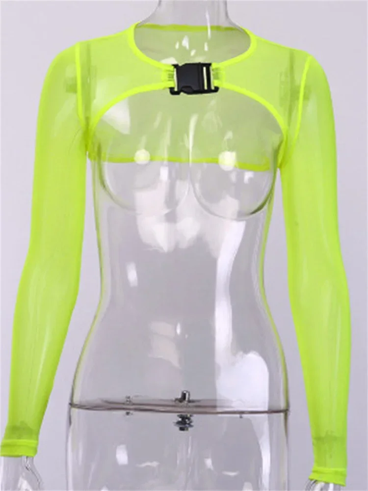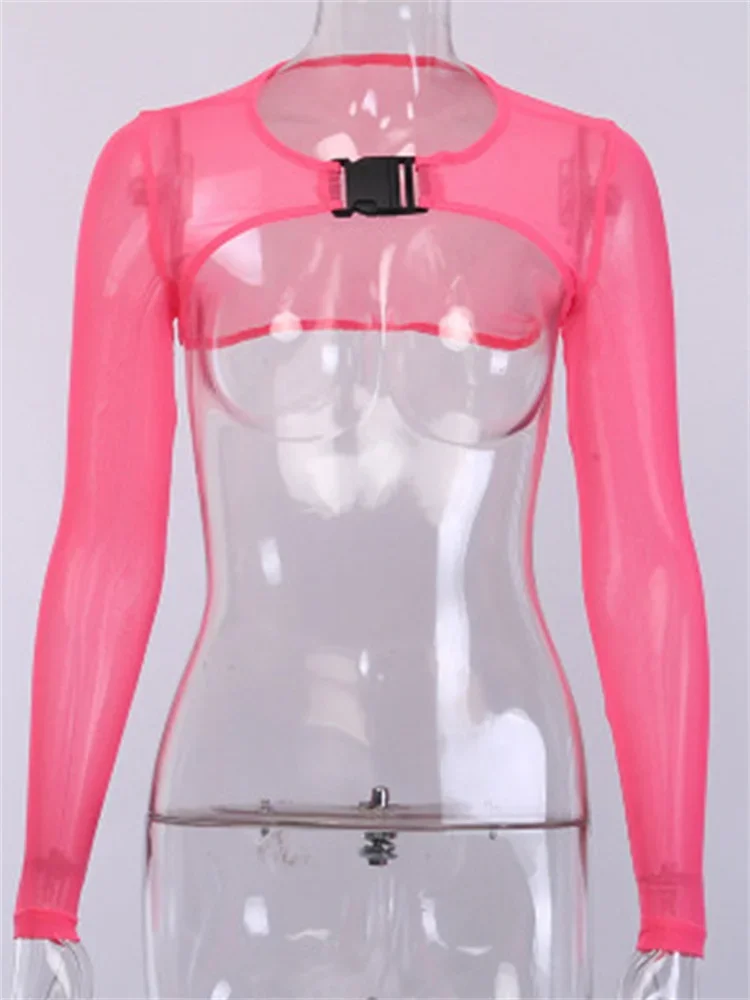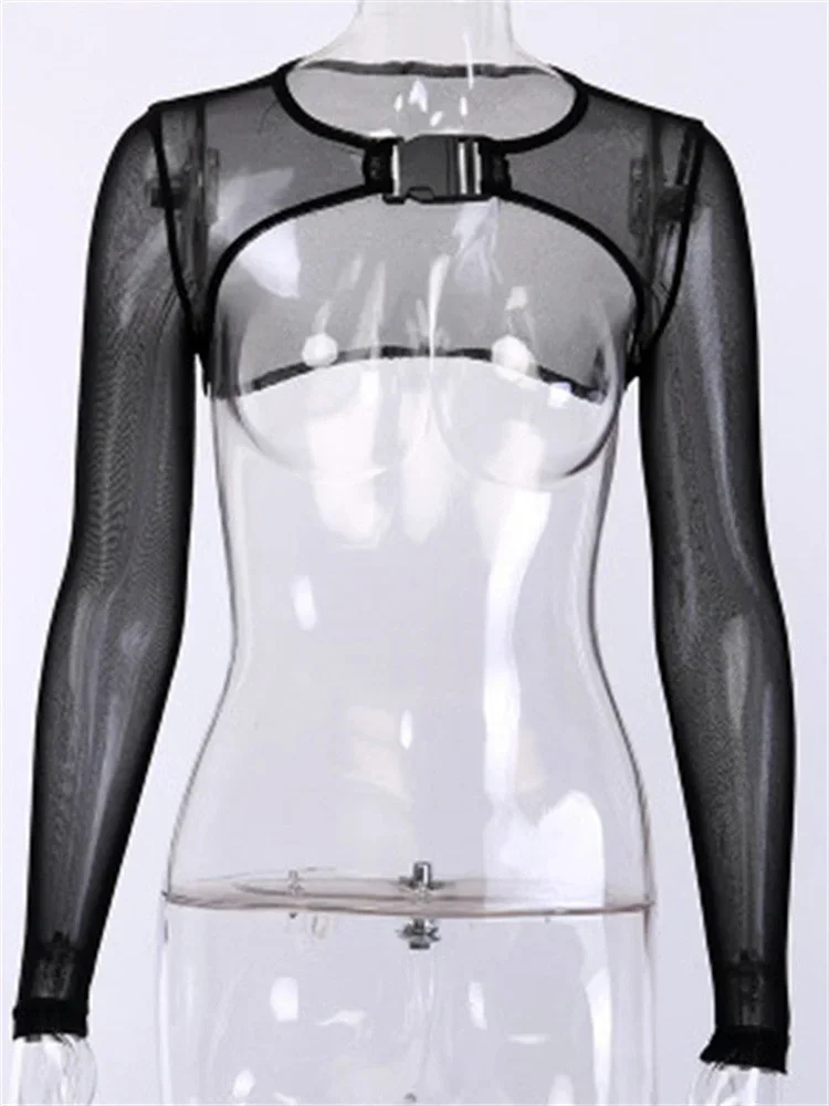 Women Super Short Mesh Shrug Tops Summer Long Sleeve Buckle Crop Tops Beach Club Sexy T-shirt Female Cover-ups
